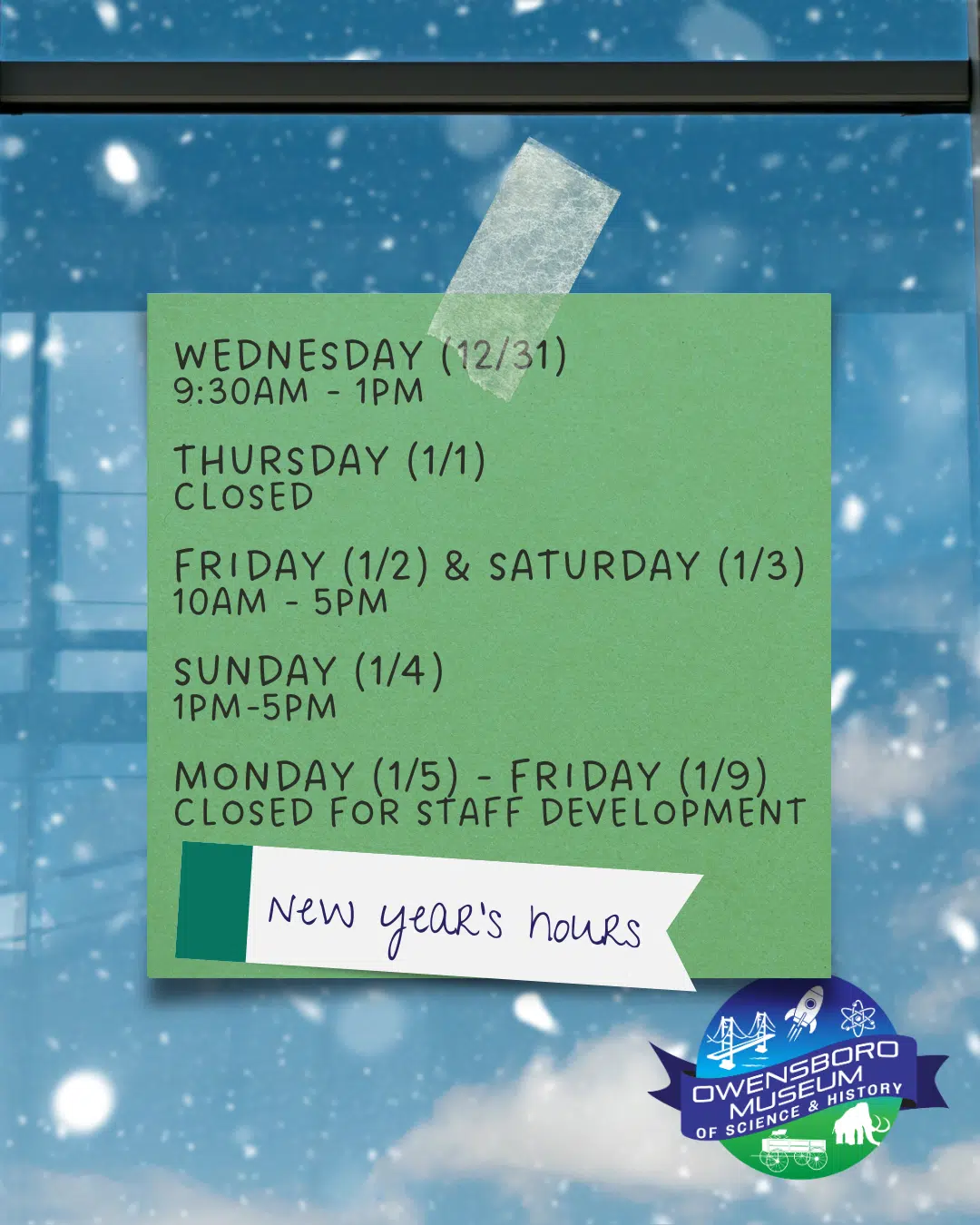 Wednesday (12/31): 9:30am – 1pm